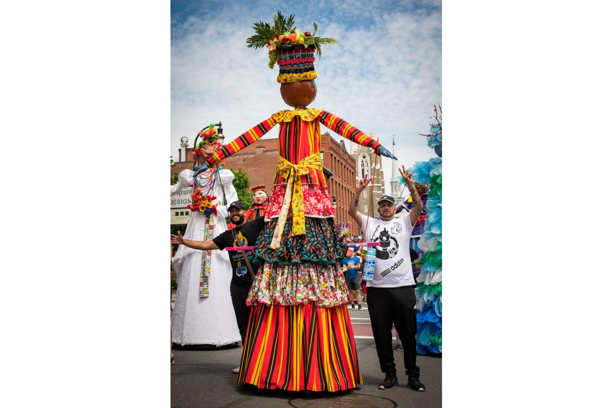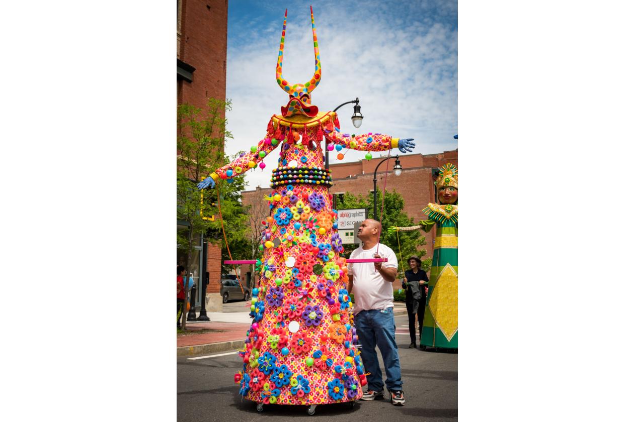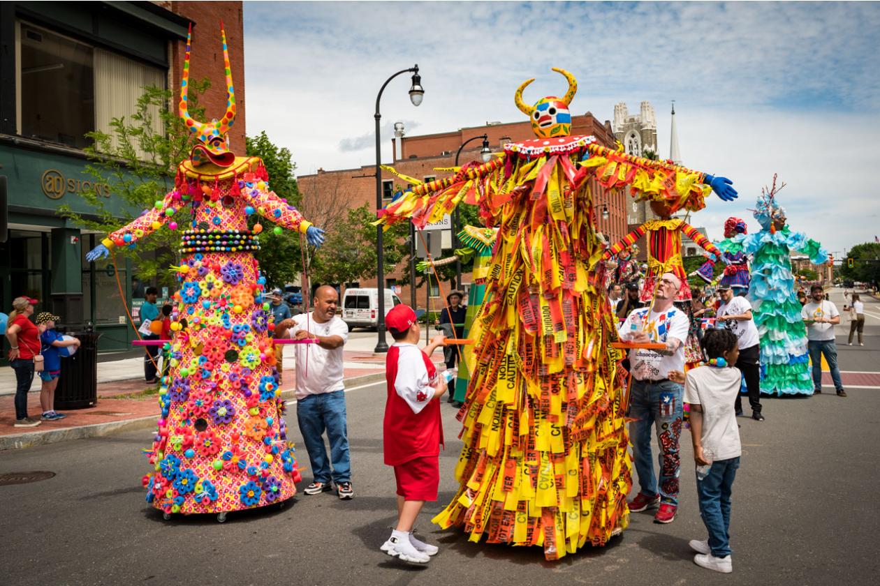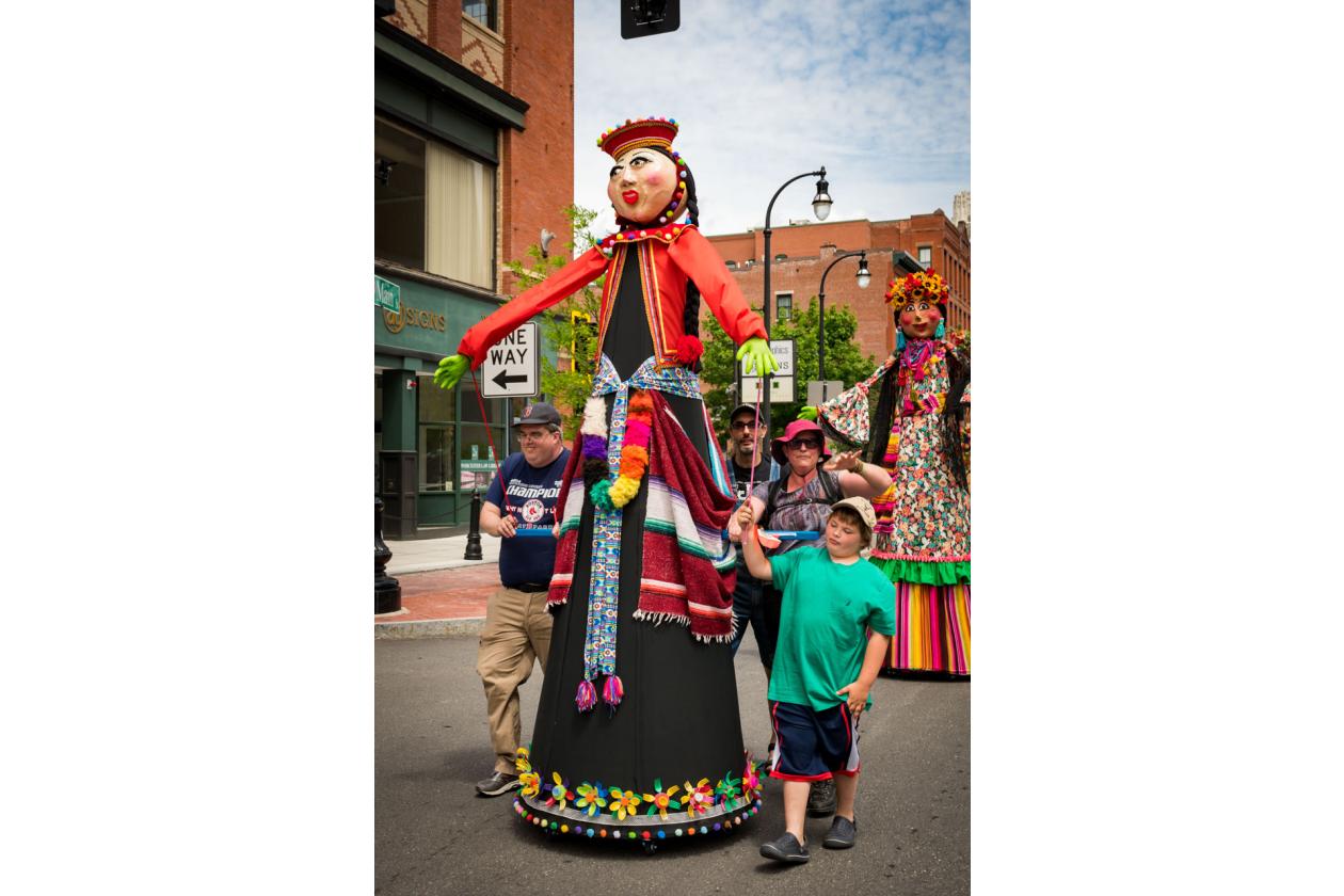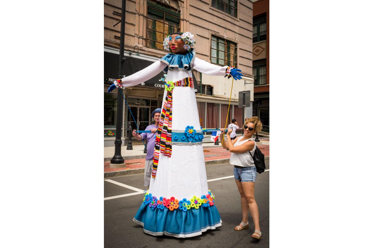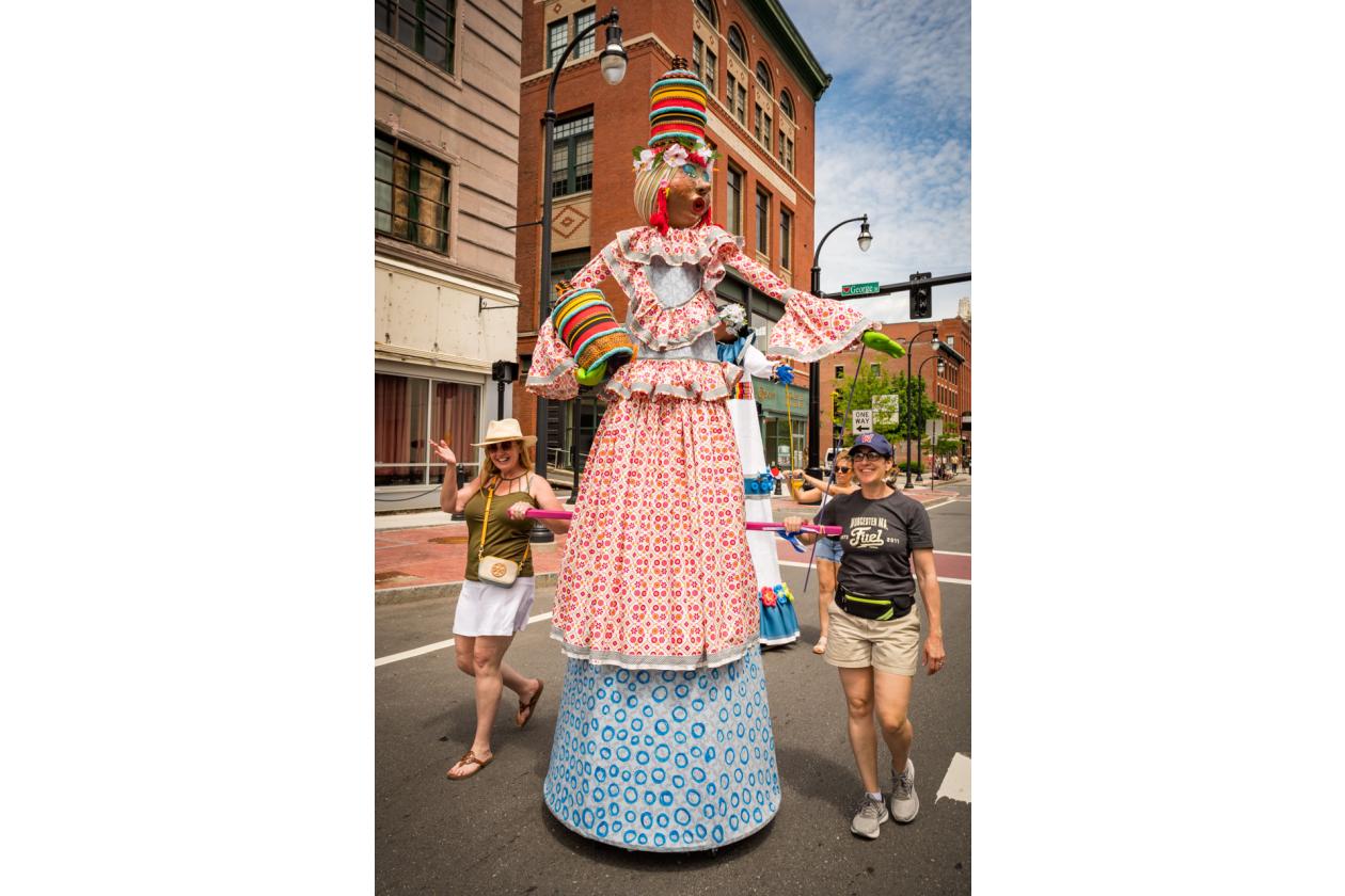 “We Are Worcester” is a community project that was created for the celebration of Worcester’s 300th birthday, to be part of the Worcester Tercentennial parade. For two months, several organizations, artists and community members collaborated to make one of the largest-scale sculptures the city of Worcester has ever had. In partnership with Guardians of Traditions and Creative Hub Worcester, and Dominican artist Luis Rivas, the community came together to design and execute eighteen large-scale, three-dimensional sculpture dolls that represent the diversity in Worcester.